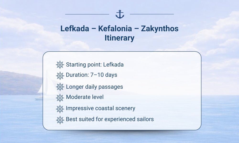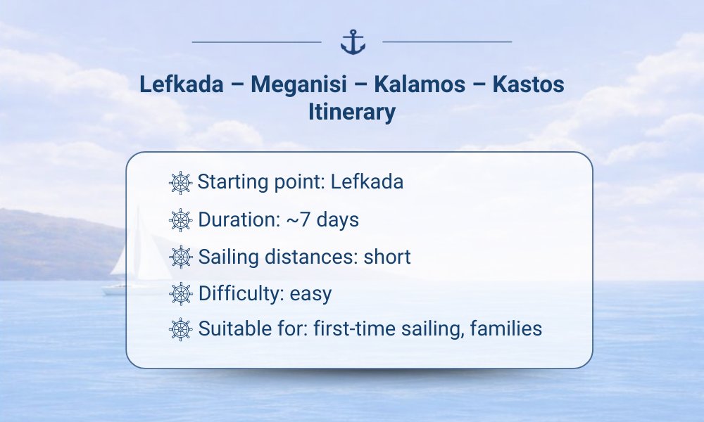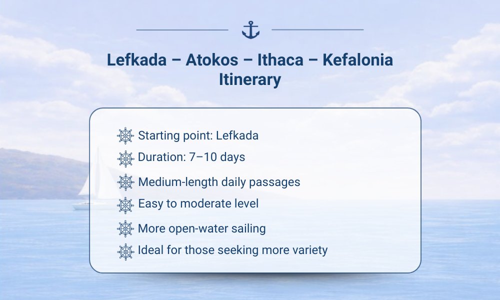 If you have sailed before and want more variety, consider extending to Ithaca or Kefalonia for longer open-water sections.