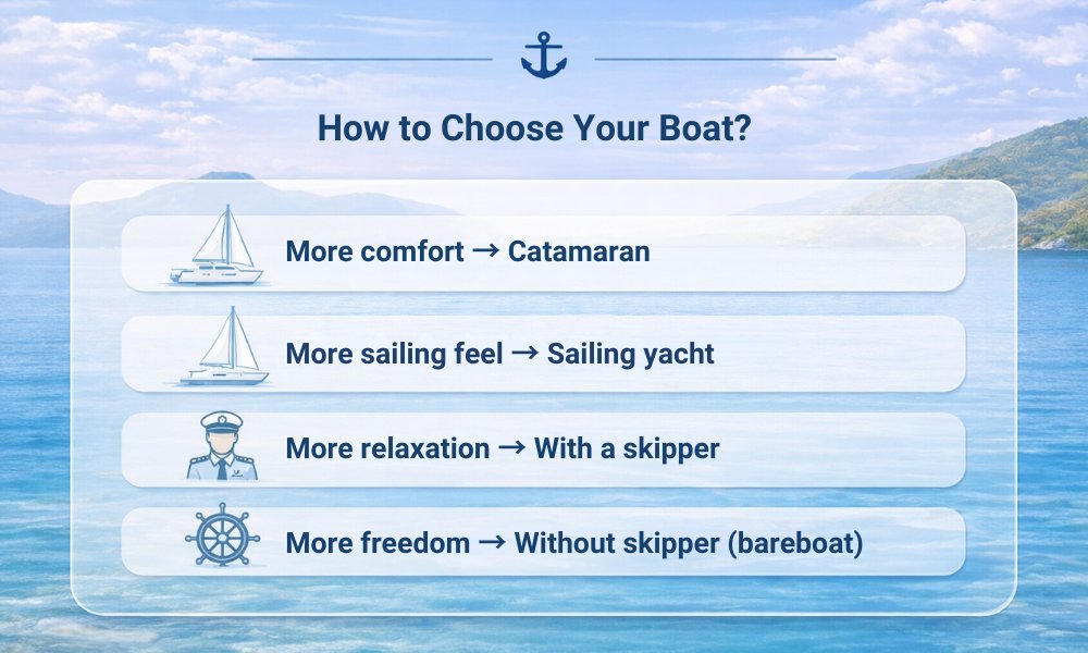 Ideal if you want to fully relax and not worry about navigation. A skipper helps choose safe anchorages and adapt to conditions.