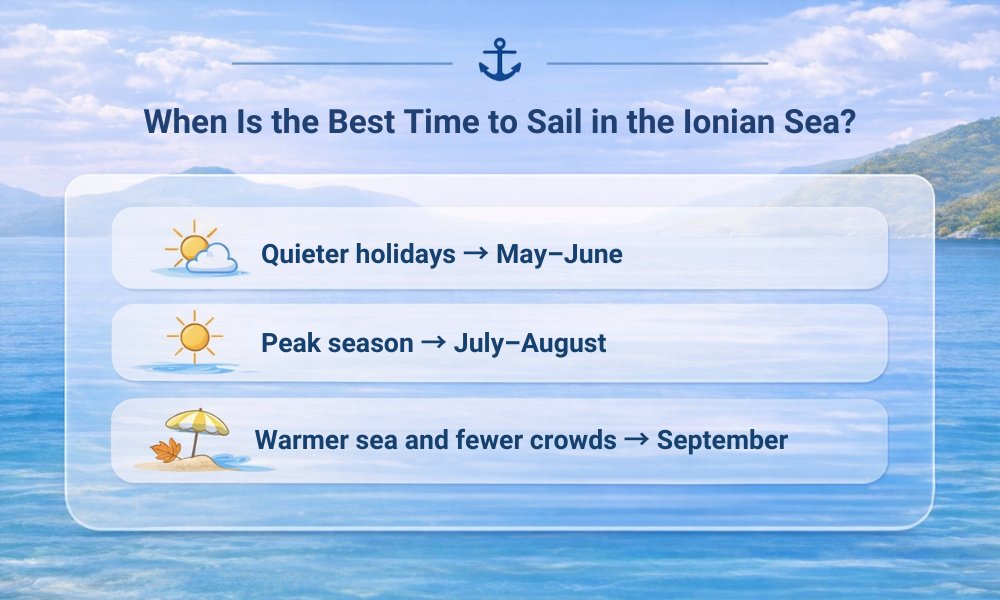 The Ionian sailing season usually runs from May to October. Conditions are generally stable, but each month has a slightly different atmosphere.