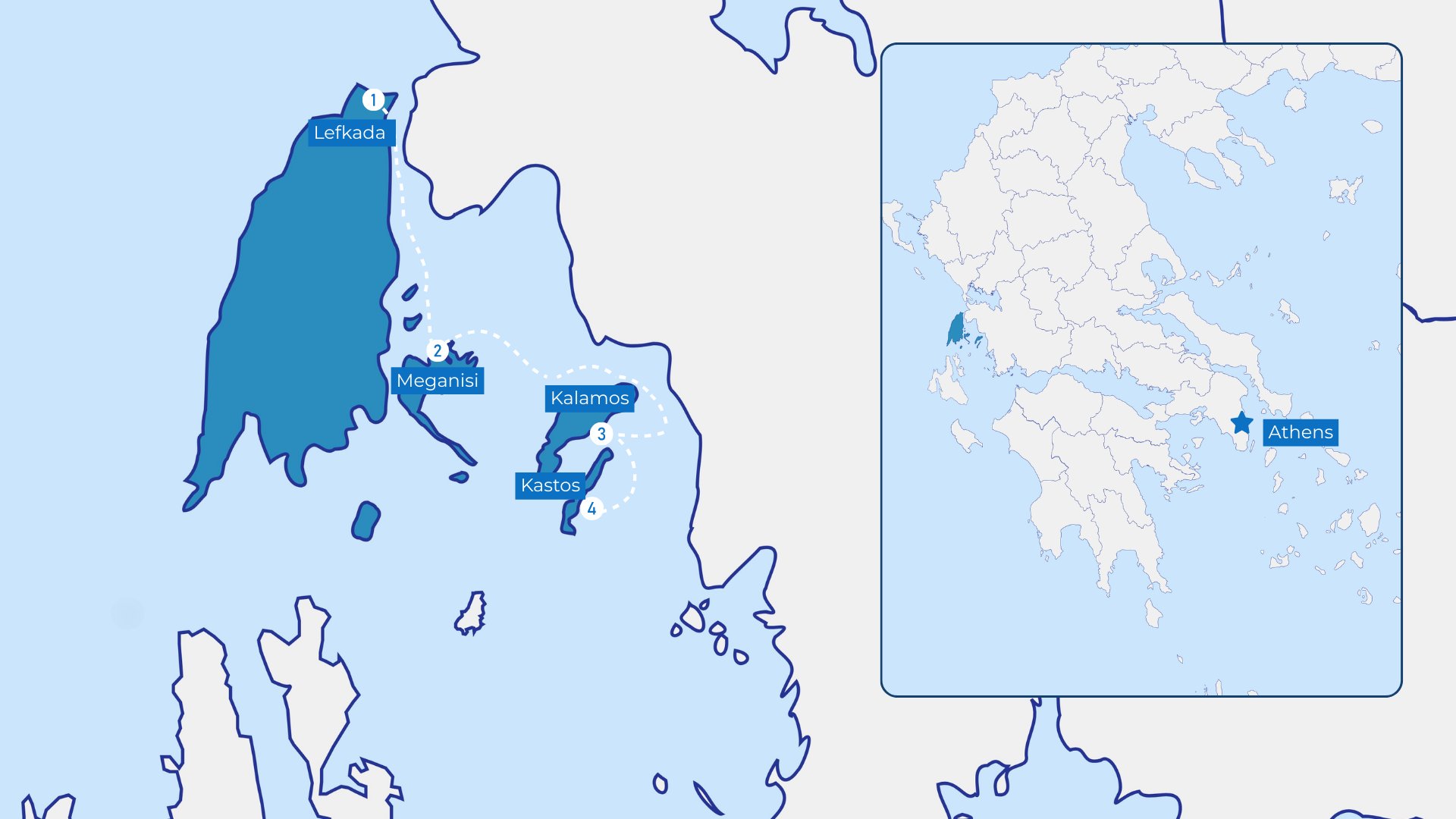 Starting from Lefkada — one of the most convenient bases in the Ionian Sea — you can reach Meganisi with its peaceful bays, then continue to Kalamos and Kastos, where the pace slows down, crowds are smaller, and the atmosphere feels more authentic.
