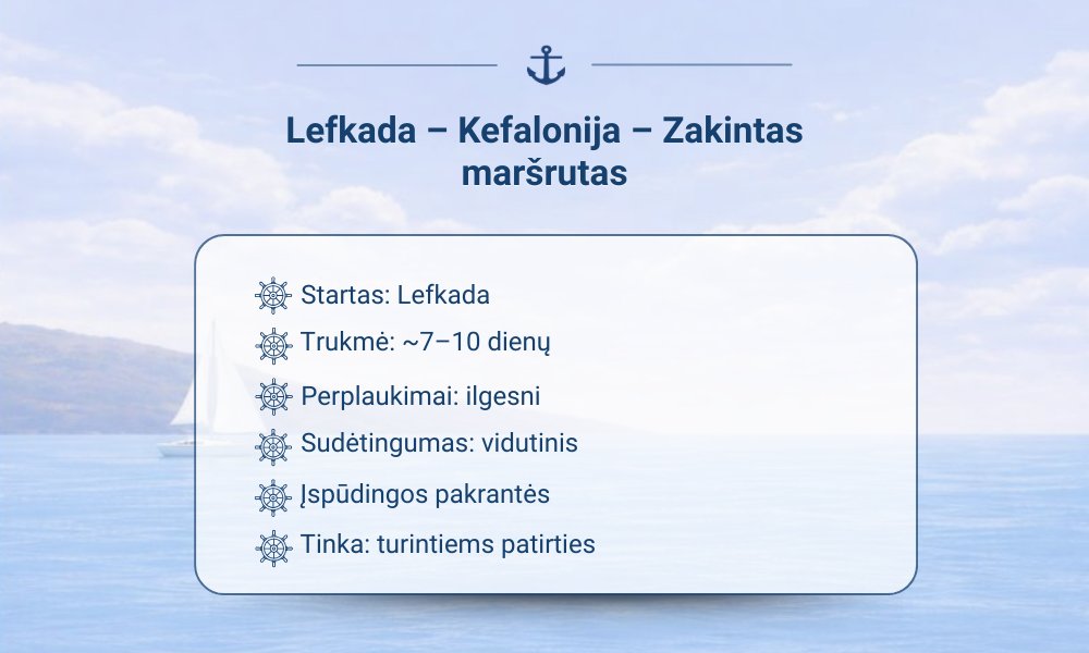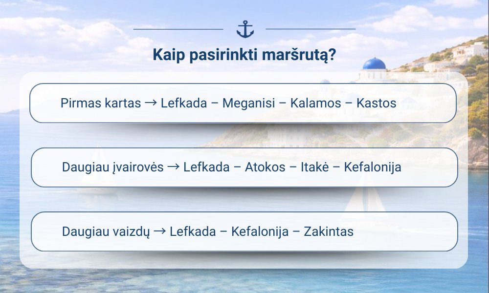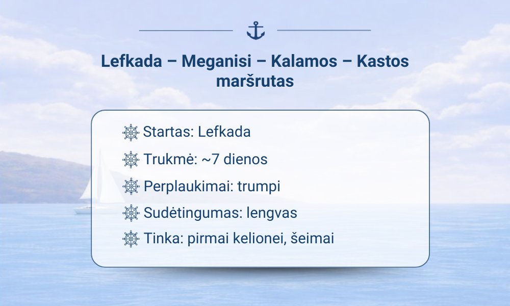 Startuojama iš Lefkados – vieno patogiausių taškų Jonijos jūroje. Iš čia pasiekiama Meganisi sala su ramiomis įlankomis, toliau – Kalamos ir Kastos, kur tempas lėtesnis, mažiau žmonių, daugiau autentiškų vietų.