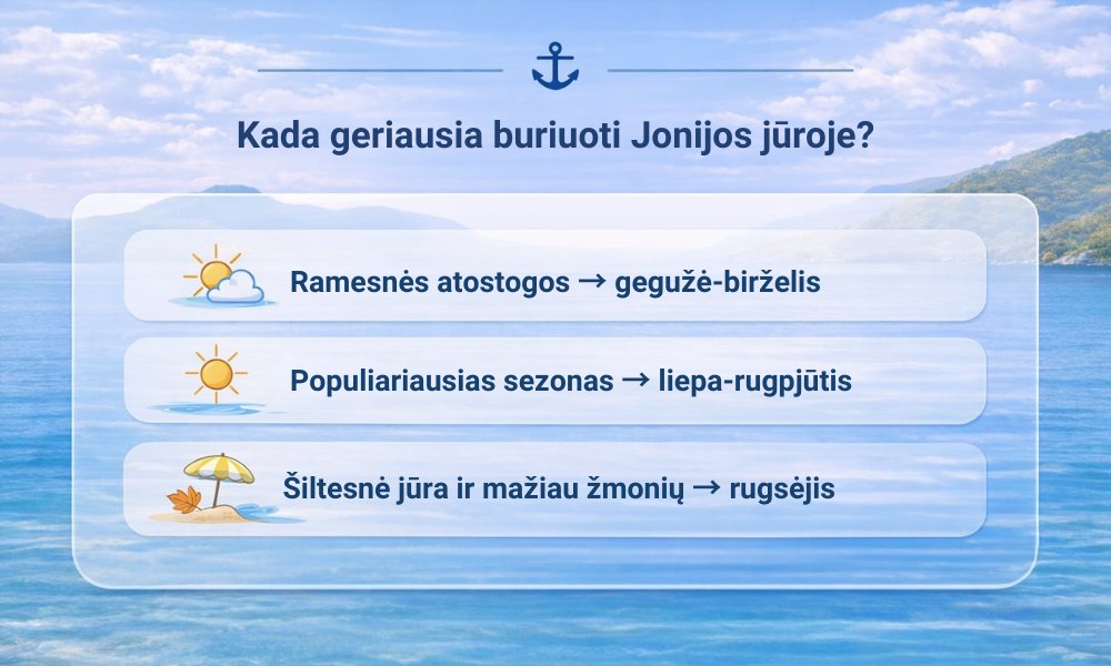 Jonijos jūros buriavimo sezonas paprastai trunka nuo gegužės iki spalio. Sąlygos šiuo laikotarpiu gana stabilios, tačiau kiekvienas mėnuo turi savo tempą ir atmosferą.
