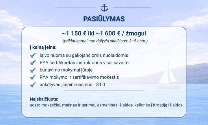 Šis pasiūlymas skirtas tiems, kurie nori daugiau nei įprastų atostogų. Per vieną savaitę Kroatijoje ne tik buriuosite moderniu laivu, bet ir įgysite tarptautinę RYA buriavimo licenciją, suteikiančią galimybę ateityje nuomotis laivus be kapitono.